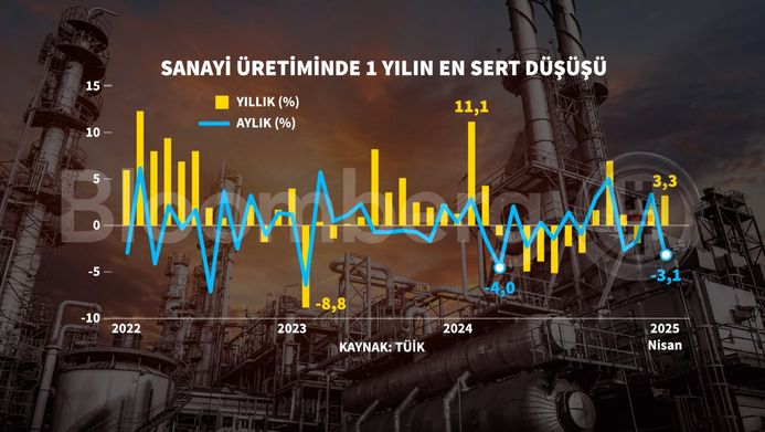 Türkiye’de sanayi üretimi aylık bazda ise yüzde 3,1 azalış gösterdi. Bu son bir yılda görülen en berbat aylık bazlı azalış oldu.
