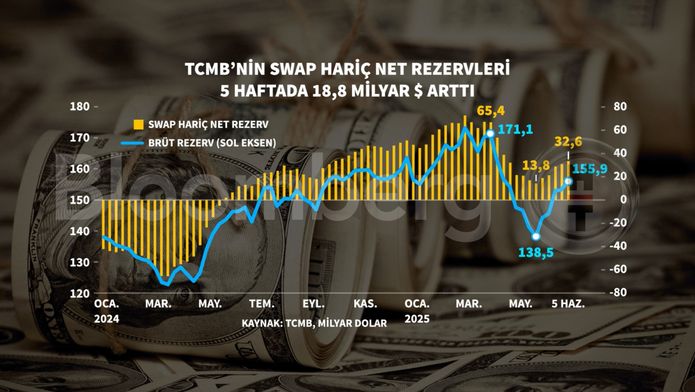 Resmi rezerv varlıkları, 5 Haziran ile sona eren haftada geçen haftaya nazaran yüzde 1,8 artarak 155,9 milyar dolar seviyesinde gerçekleşti; net rezervler 52 milyar doları aştı.
